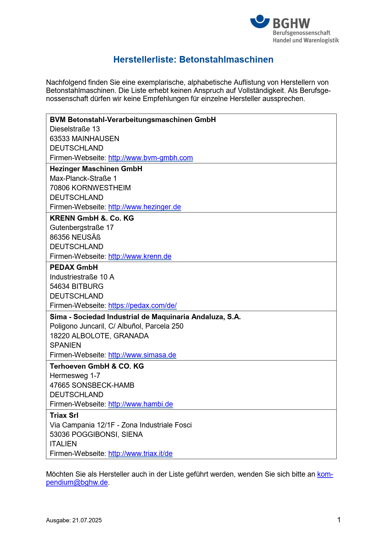 Diese Herstellerliste dient als Übersicht über verschiedene Hersteller von Betonstahlmaschinen inkl. Kontaktdaten. Die Übersicht erhebt keinen Anspruch auf Vollständigkeit.