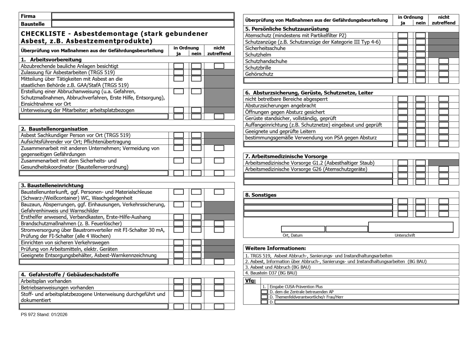 Diese Checkliste enthält wichtige Fragen zur Überprüfung der Maßnahmen aus der Gefährdungsbeurteilung für die Tätigkeit „Asbestdemontage“. Themen sind u. a.: Arbeitsvorbereitung, Baustellenorganisation, Baustelleneinrichtung, Gefahrstoffe und Gebäudeschadstoffe, Persönliche Schutzausrüstung, Absturzsicherung und die arbeitsmedizinische Vorsorge.
