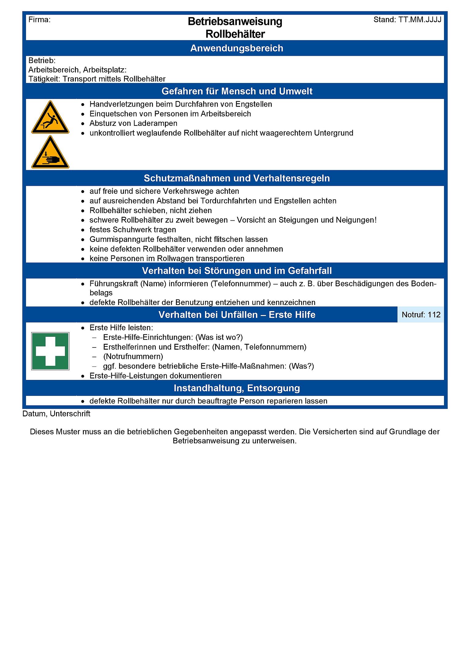 Diese Muster-Betriebsanweisung thematisiert Gefährdungen beim Transport mittels Rollbehältern und enthält Informationen u. a. zu Schutzmaßnahmen und zum Verhalten im Gefahren- oder Störfall. Dieses Muster muss an die betrieblichen Gegebenheiten angepasst werden.