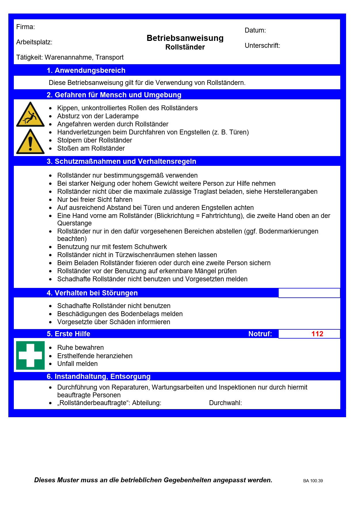Diese Muster-Betriebsanweisung thematisiert Gefährdungen bei der Verwendung von Rollständern für die Warenannahme und den Warentransport. Sie enthält Informationen u. a. zu Schutzmaßnahmen und zum Verhalten im Gefahren- oder Störfall. Dieses Muster muss an die betrieblichen Gegebenheiten angepasst werden.