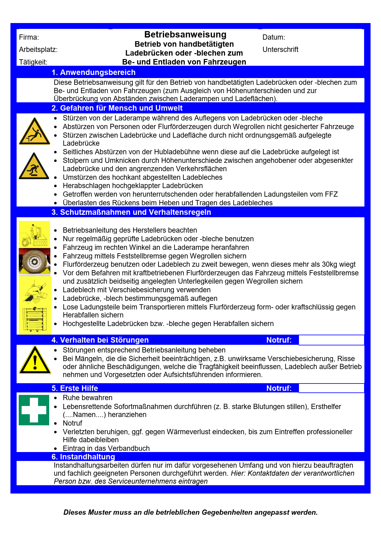 Diese Muster-Betriebsanweisung thematisiert Gefährdungen beim Umgang mit handbetätigten Ladebrücken und enthält Informationen u. a. zu Schutzmaßnahmen und zum Verhalten im Gefahren- oder Störfall. Dieses Muster muss an die betrieblichen Gegebenheiten angepasst werden.