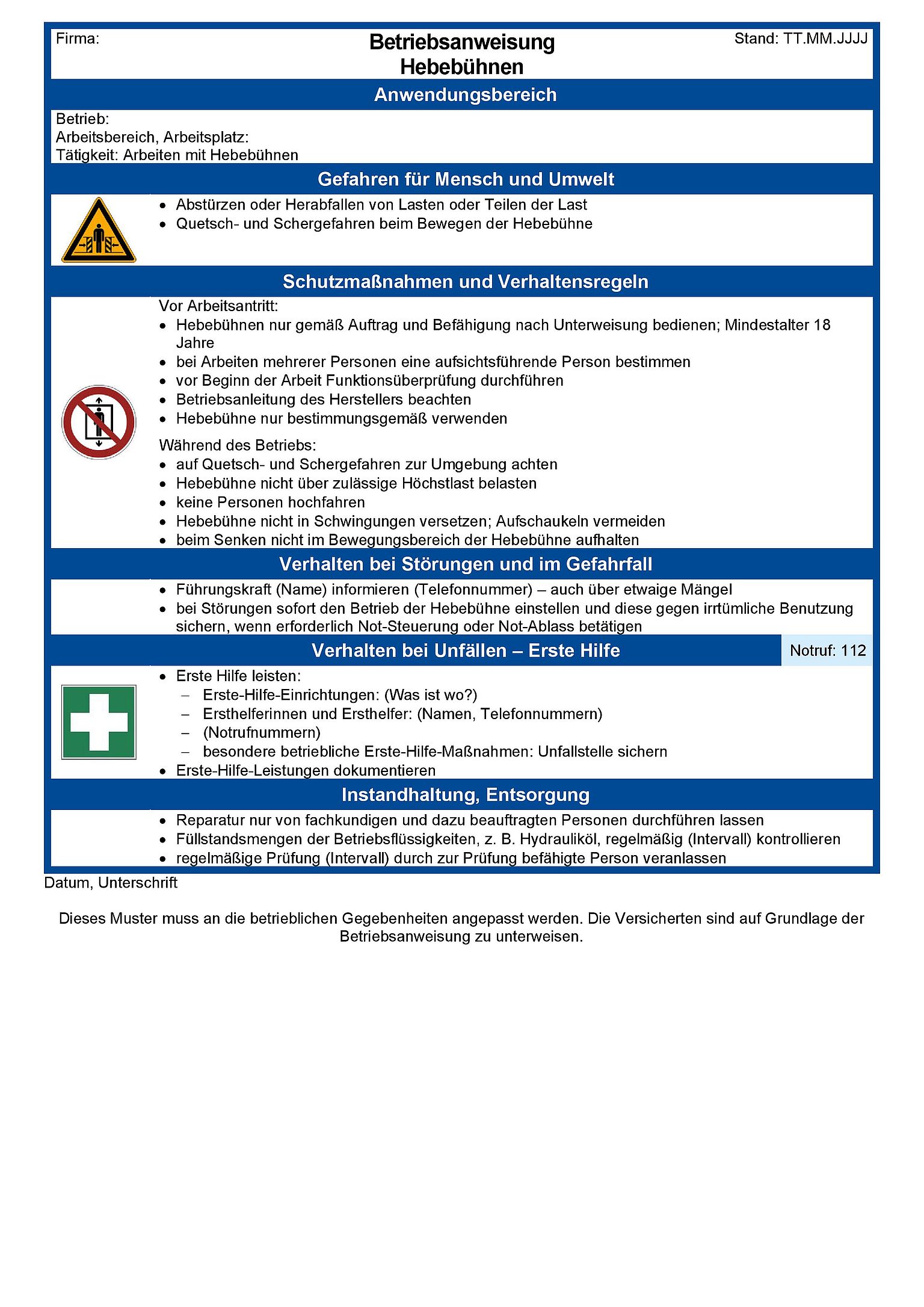 Diese Muster-Betriebsanweisung thematisiert Gefährdungen beim Umgang mit Hebebühnen und enthält Informationen u. a. zu Schutzmaßnahmen und zum Verhalten im Gefahren- oder Störfall. Dieses Muster muss an die betrieblichen Gegebenheiten angepasst werden.