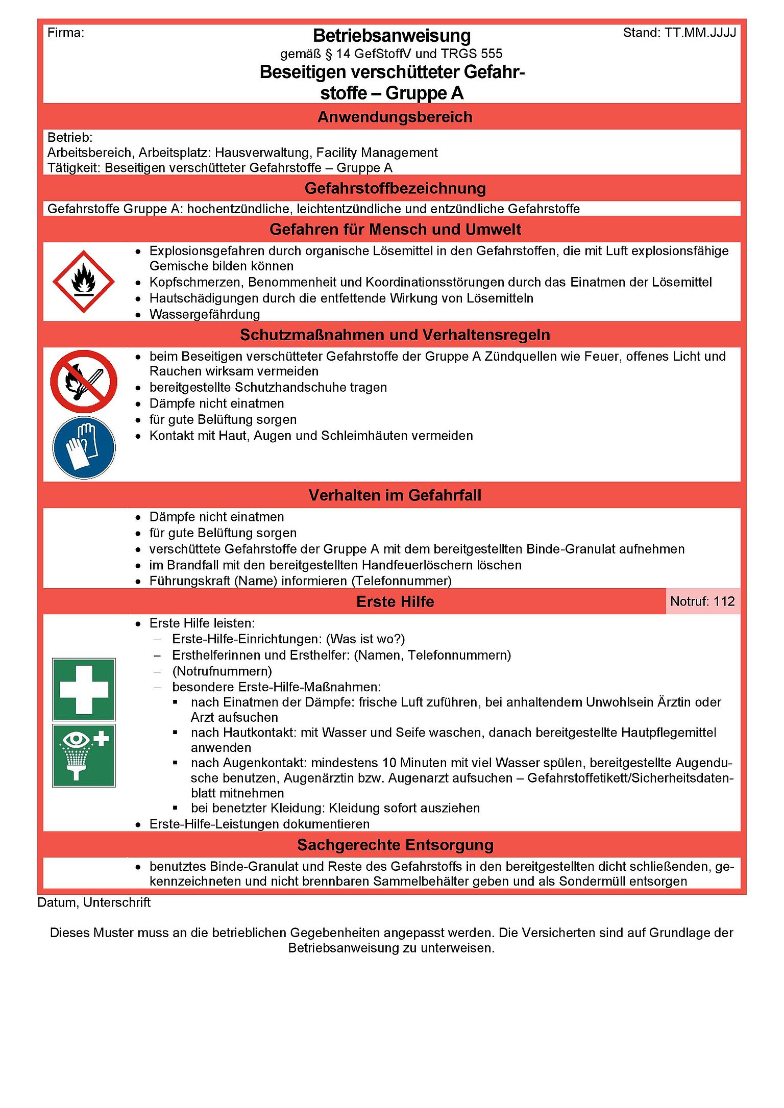 Diese Muster-Betriebsanweisung thematisiert Gefährdungen beim Verschütten hochentzündlicher, leichtentzündlicher und entzündlicher Gefahrstoffe und enthält Informationen u. a. zu Schutzmaßnahmen und zum Verhalten im Gefahren- oder Störfall. Dieses Muster muss an die betrieblichen Gegebenheiten angepasst werden.