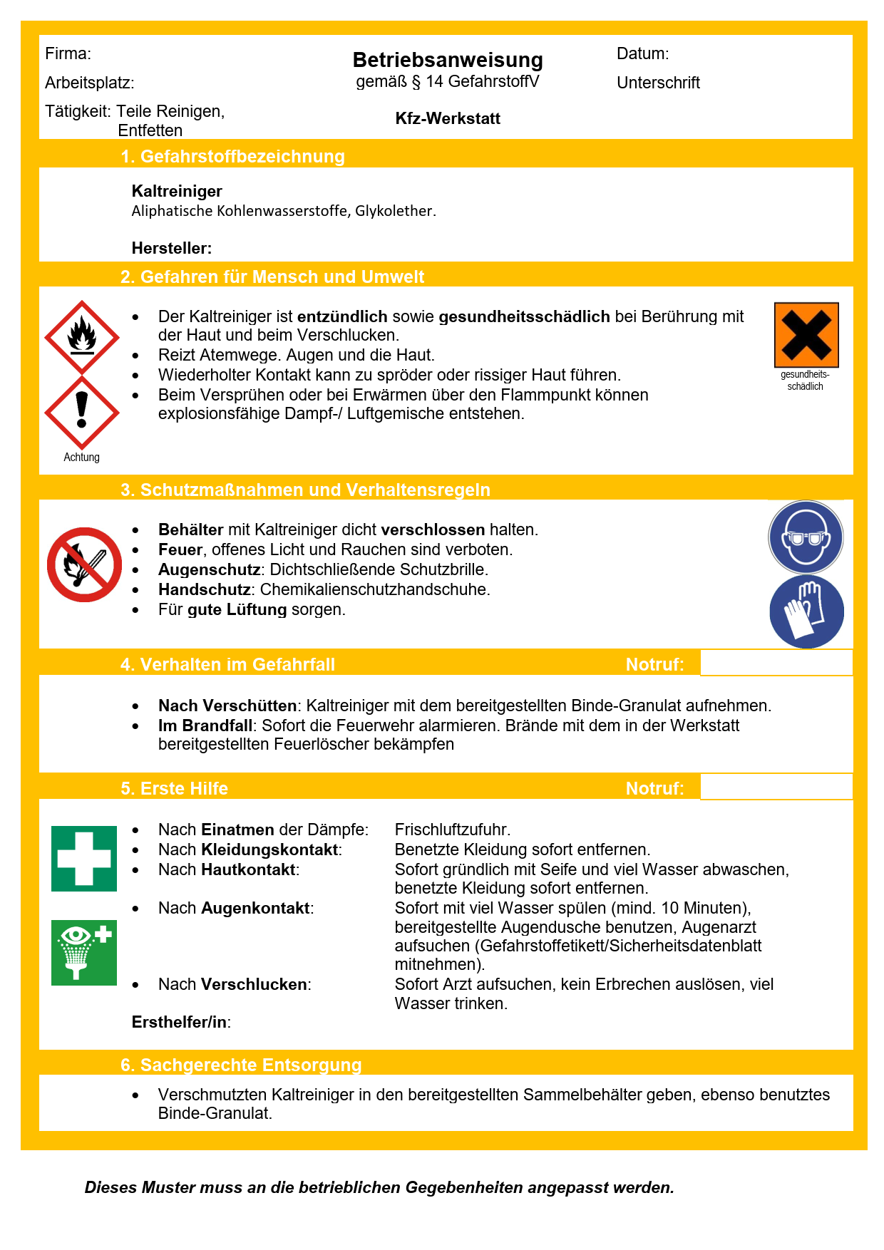 Diese Muster-Betriebsanweisung thematisiert Gefährdungen durch den Umgang mit Kaltreiniger in Kfz-Werkstätten und enthält Informationen u. a. zu Schutzmaßnahmen und zum Verhalten im Gefahren- oder Störfall. Dieses Muster muss an die betrieblichen Gegebenheiten angepasst werden.