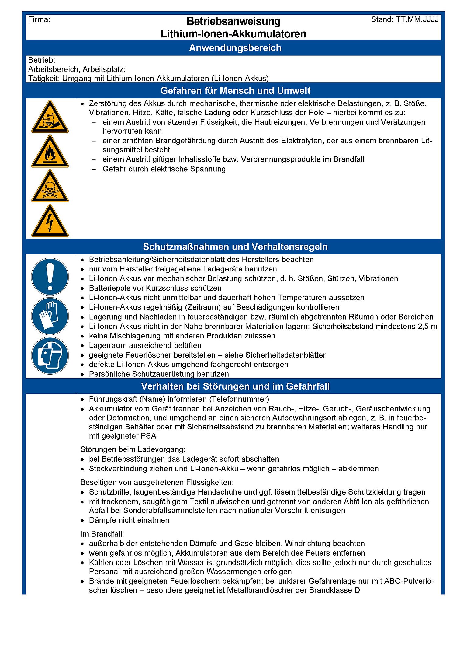 Diese Muster-Betriebsanweisung thematisiert Gefährdungen durch Lithium-Ionen-Akkumulatoren und enthält Informationen u. a. zu Schutzmaßnahmen und zum Verhalten im Gefahren- oder Störfall. Dieses Muster muss an die betrieblichen Gegebenheiten angepasst werden.