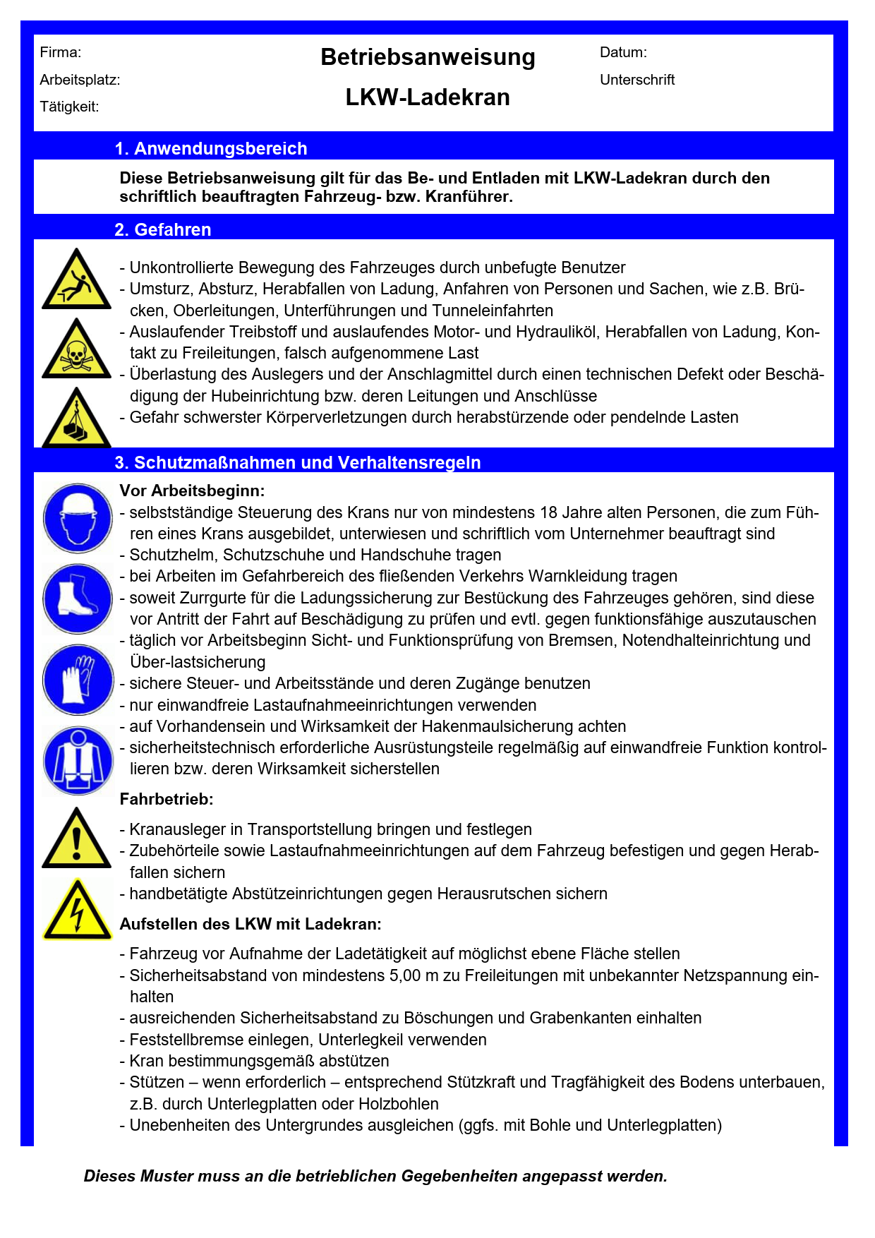 Diese Muster-Betriebsanweisung thematisiert Gefährdungen beim Umgang mit Lkw-Ladekranen und enthält Informationen u. a. zu Schutzmaßnahmen und zum Verhalten im Gefahren- oder Störfall. Dieses Muster muss an die betrieblichen Gegebenheiten angepasst werden.