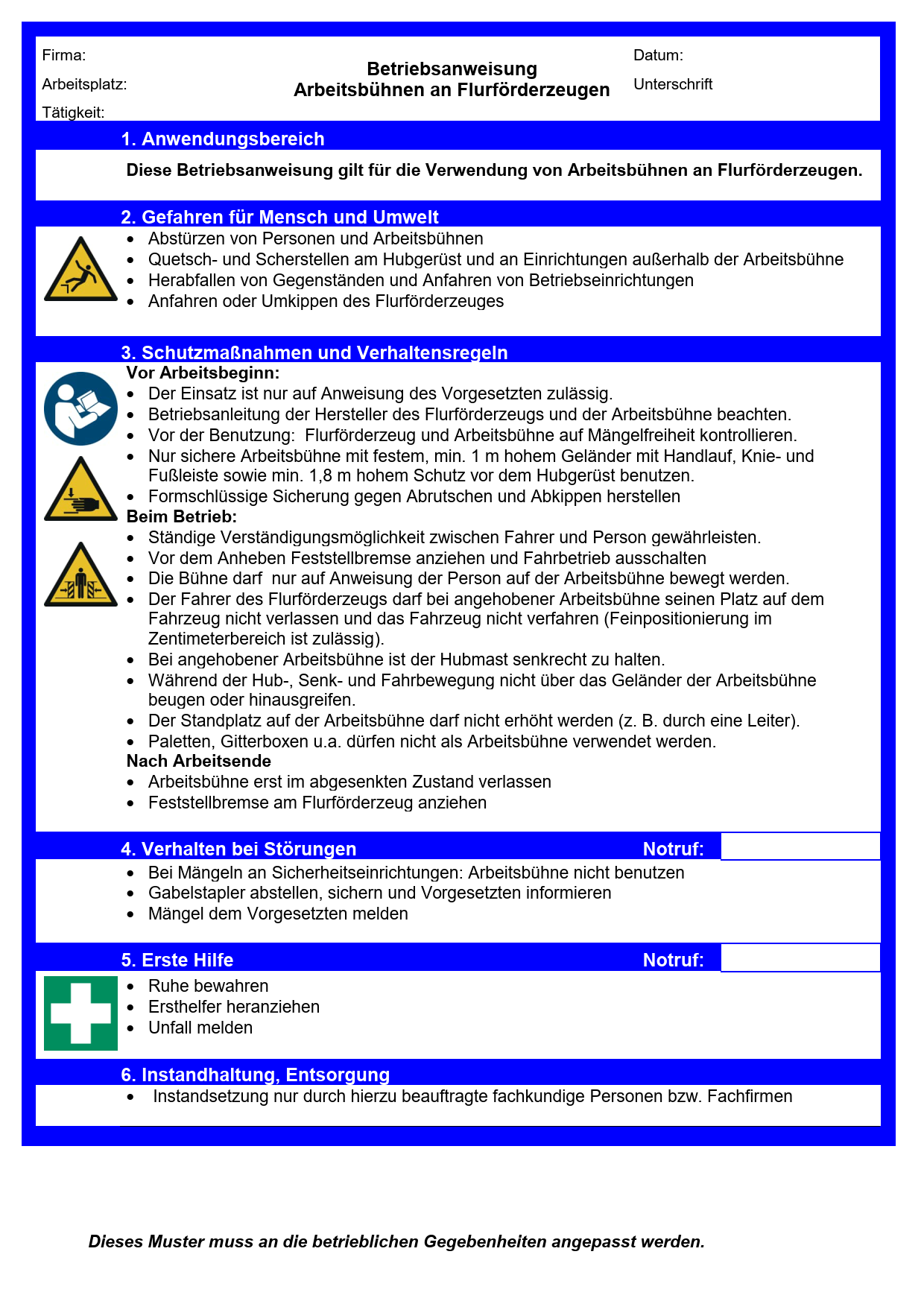 Diese Muster-Betriebsanweisung thematisiert Gefährdungen durch Arbeitsbühnen an Flurförderzeugen und enthält Informationen u. a. zu Schutzmaßnahmen und zum Verhalten im Gefahren- oder Störfall. Dieses Muster muss an die betrieblichen Gegebenheiten angepasst werden.