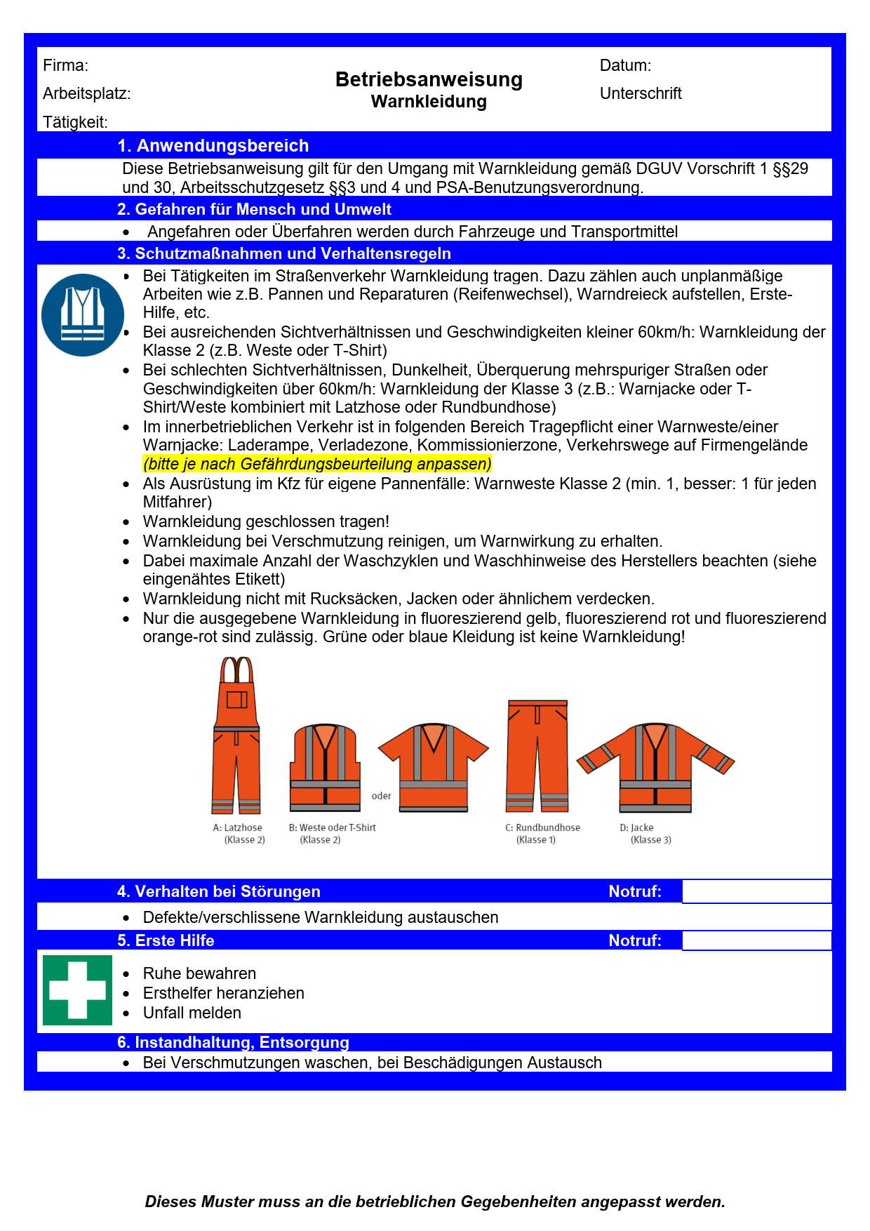 Diese Muster-Betriebsanweisung thematisiert die Nutzung von Warnkleidung und enthält Informationen insbesondere zum richtigen Einsatz und zur Instandhaltung. Dieses Muster muss an die betrieblichen Gegebenheiten angepasst werden.