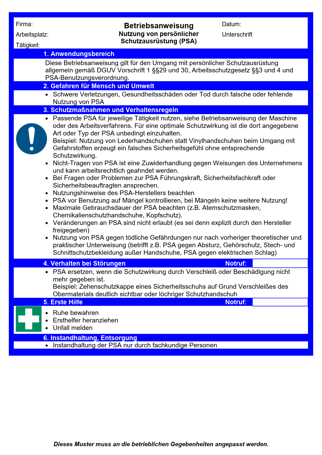 Diese Muster-Betriebsanweisung thematisiert die Nutzung von PSA allgemein und enthält Informationen insbesondere zum richtigen Einsatz und zur Instandhaltung. Dieses Muster muss an die betrieblichen Gegebenheiten angepasst werden.