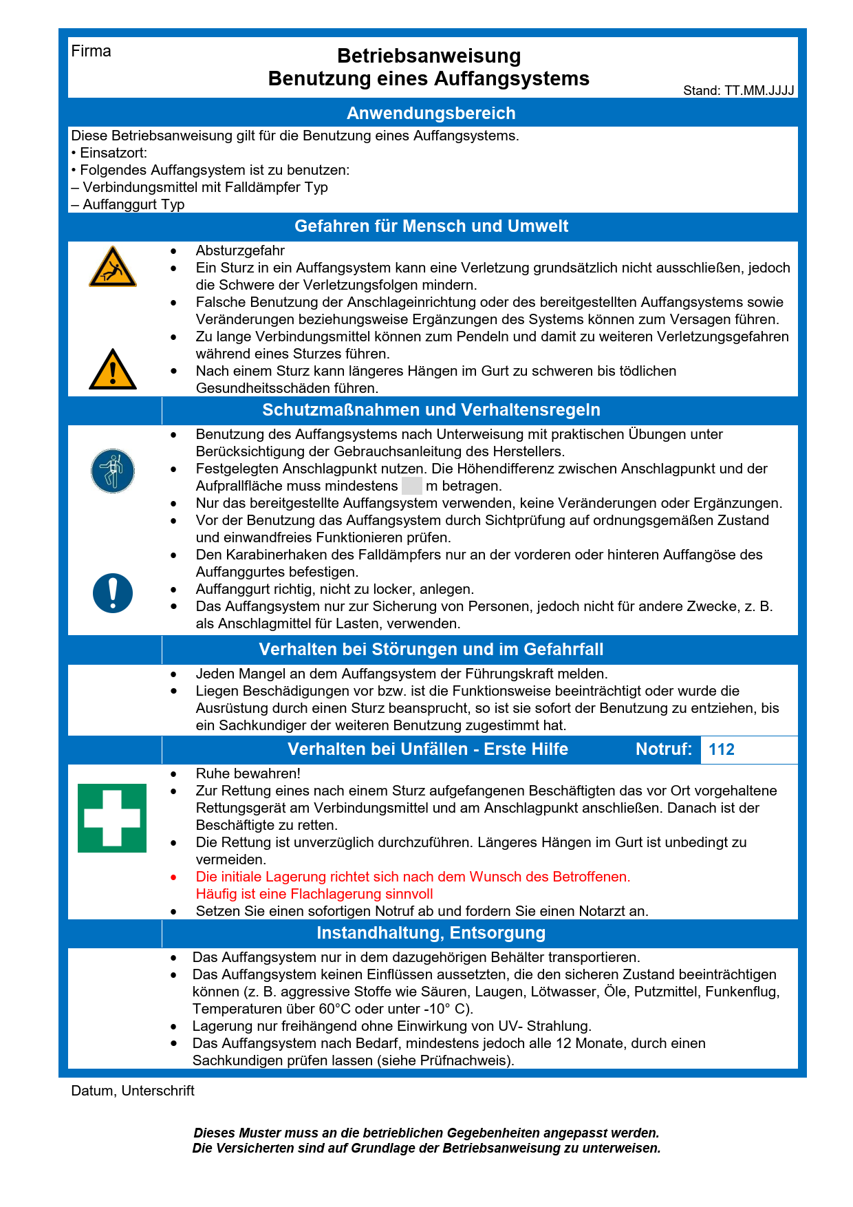 Diese Muster-Betriebsanweisung thematisiert Gefährdungen beim Einsatz von Auffangsystemen (PSA gegen Absturz) und enthält Informationen insbesondere zum richtigen Einsatz und zur Instandhaltung. Dieses Muster muss an die betrieblichen Gegebenheiten angepasst werden.