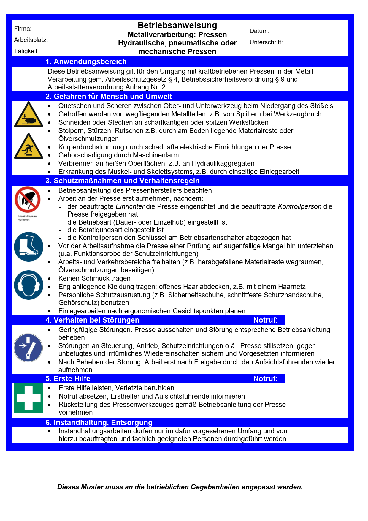 Diese Muster-Betriebsanweisung thematisiert Gefährdungen beim Umgang mit hydraulischen, pneumatischen sowie mechanischen Pressen und enthält Informationen u. a. zu Schutzmaßnahmen und zum Verhalten im Gefahren- oder Störfall. Dieses Muster muss an die betrieblichen Gegebenheiten angepasst werden.