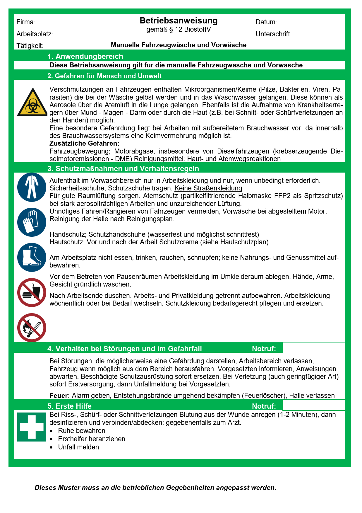 Diese Muster-Betriebsanweisung thematisiert Gefährdungen bei der manuellen Fahrzeugwäsche sowie Vorwäsche und enthält Informationen u. a. zu Schutzmaßnahmen und zum Verhalten im Gefahren- oder Störfall. Dieses Muster muss an die betrieblichen Gegebenheiten angepasst werden.