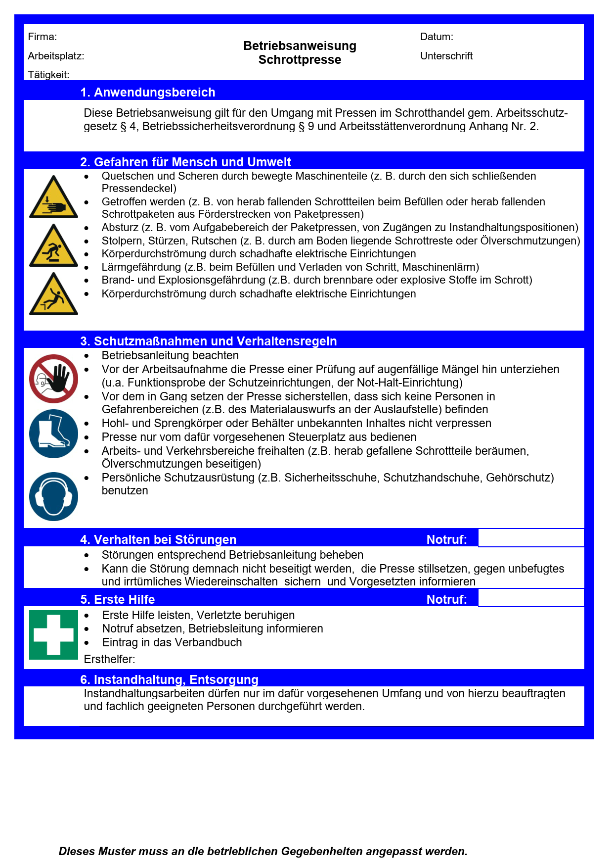 Diese Muster-Betriebsanweisung thematisiert Gefährdungen durch Schrottpressen und enthält Informationen u. a. zu Schutzmaßnahmen und zum Verhalten im Gefahren- oder Störfall. Dieses Muster muss an die betrieblichen Gegebenheiten angepasst werden.
