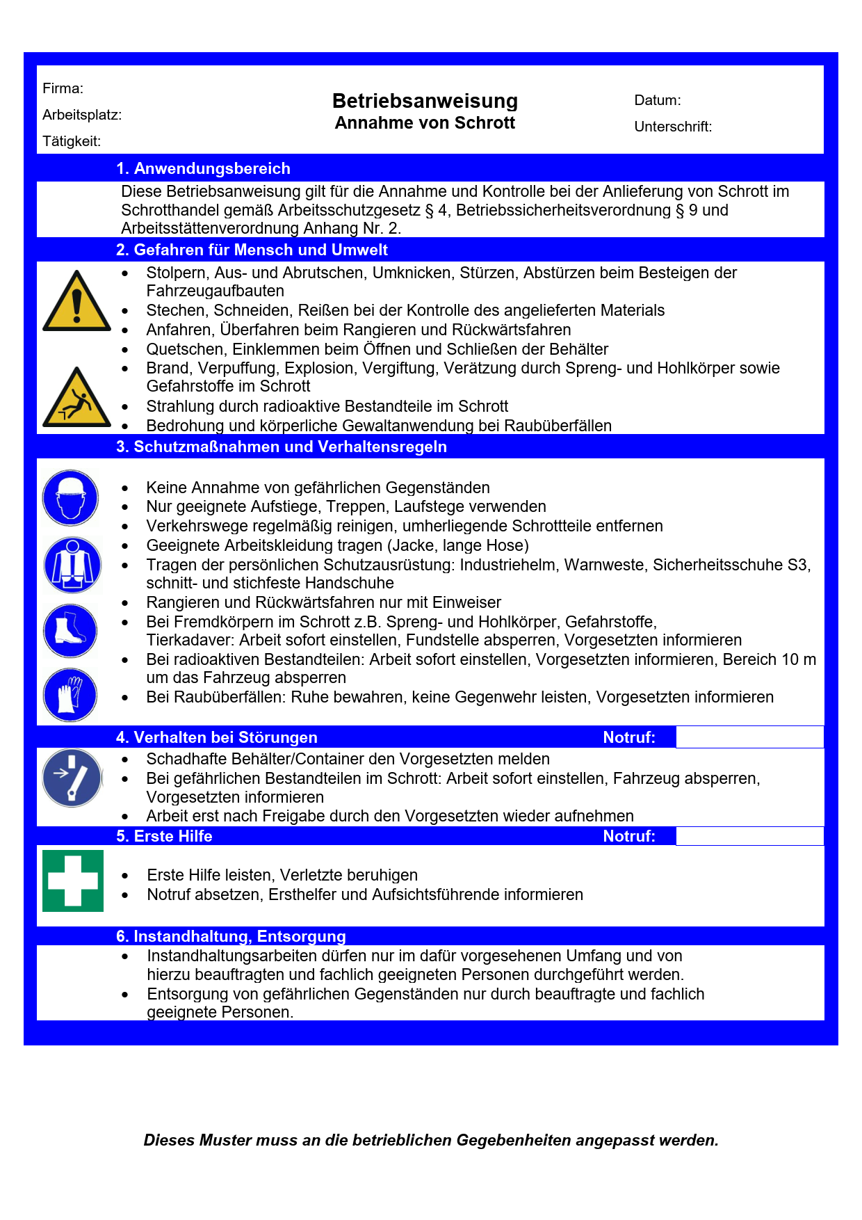 Diese Muster-Betriebsanweisung thematisiert Gefährdungen bei der Annahme von Schrott sowie zur Kontrolle bei der Anlieferung. Sie enthält Informationen u. a. zu Schutzmaßnahmen und zum Verhalten im Gefahren- oder Störfall. Dieses Muster muss an die betrieblichen Gegebenheiten angepasst werden.