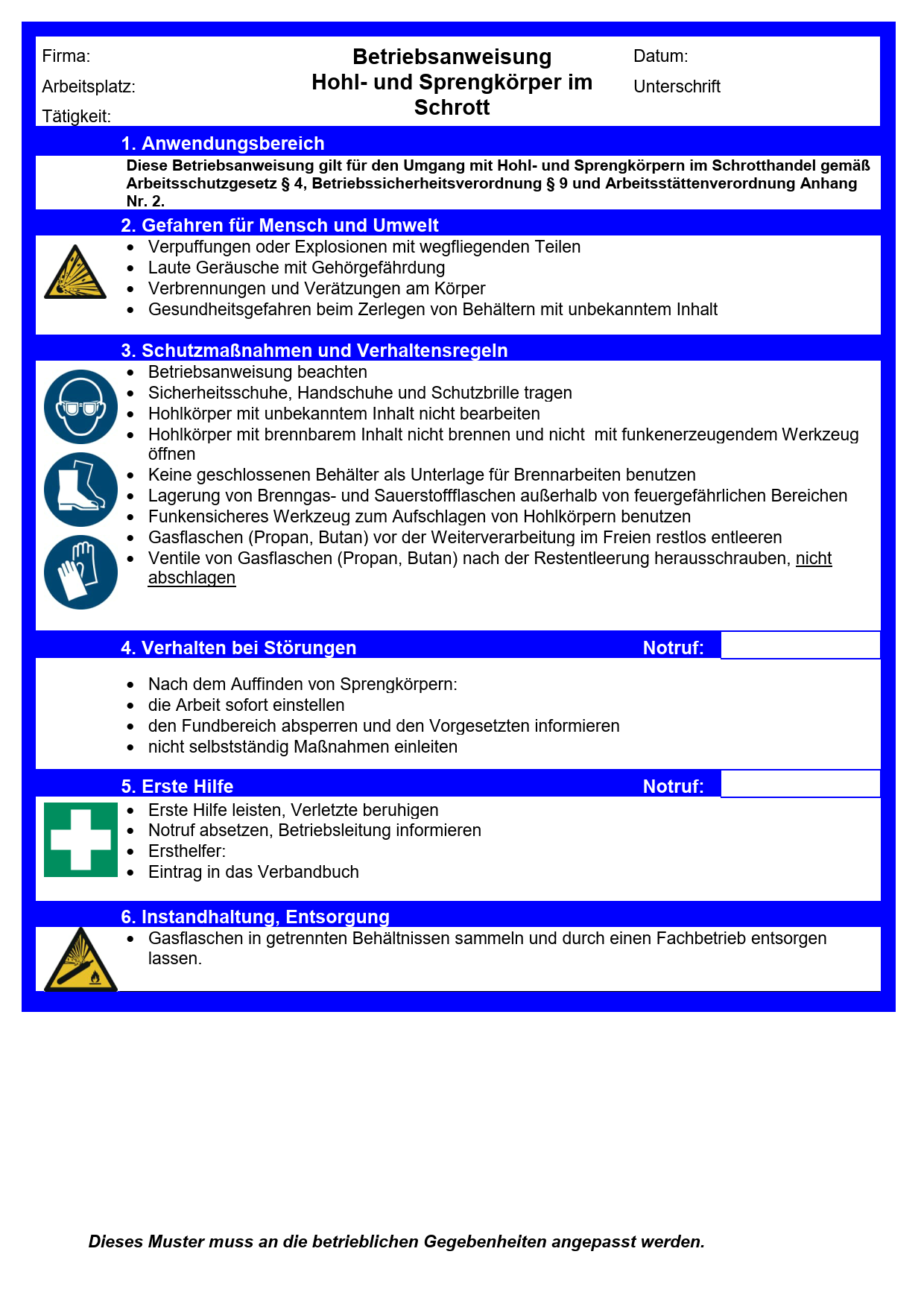 Diese Muster-Betriebsanweisung thematisiert Gefährdungen durch Hohlkörper und Sprengkörper im Schrott und enthält Informationen u. a. zu Schutzmaßnahmen und zum Verhalten im Gefahren- oder Störfall. Dieses Muster muss an die betrieblichen Gegebenheiten angepasst werden.