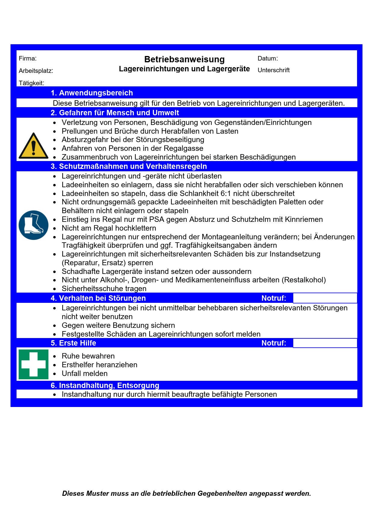 Diese Muster-Betriebsanweisung thematisiert Gefährdungen durch Lagereinrichtungen sowie Lagergeräte und enthält Informationen u. a. zu Schutzmaßnahmen und zum Verhalten im Gefahren- oder Störfall. Dieses Muster muss an die betrieblichen Gegebenheiten angepasst werden.