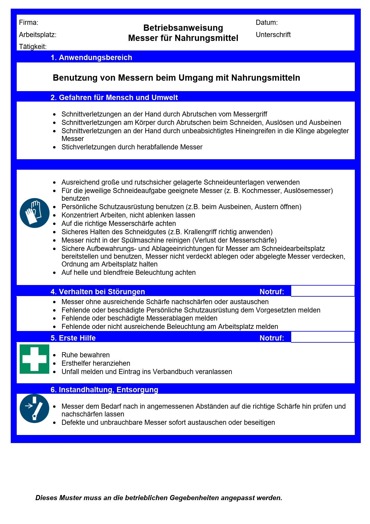 Diese Muster-Betriebsanweisung thematisiert Gefährdungen beim Umgang mit Messern für Nahrungsmittel in Küchen, Fleischereien und an der Frischetheke. Sie enthält Informationen u. a. zu Schutzmaßnahmen und zum Verhalten im Gefahren- oder Störfall. Dieses Muster muss an die betrieblichen Gegebenheiten angepasst werden.