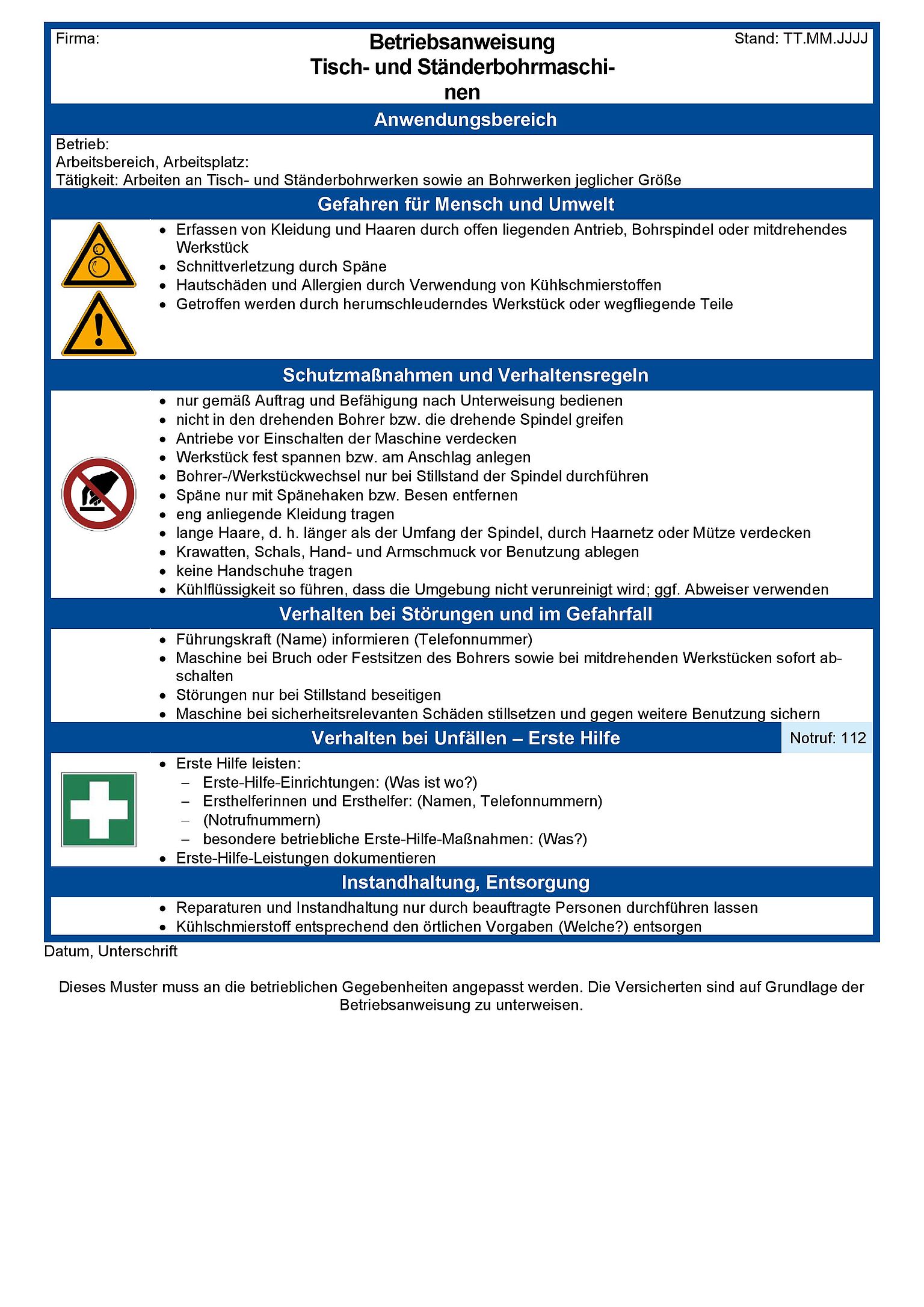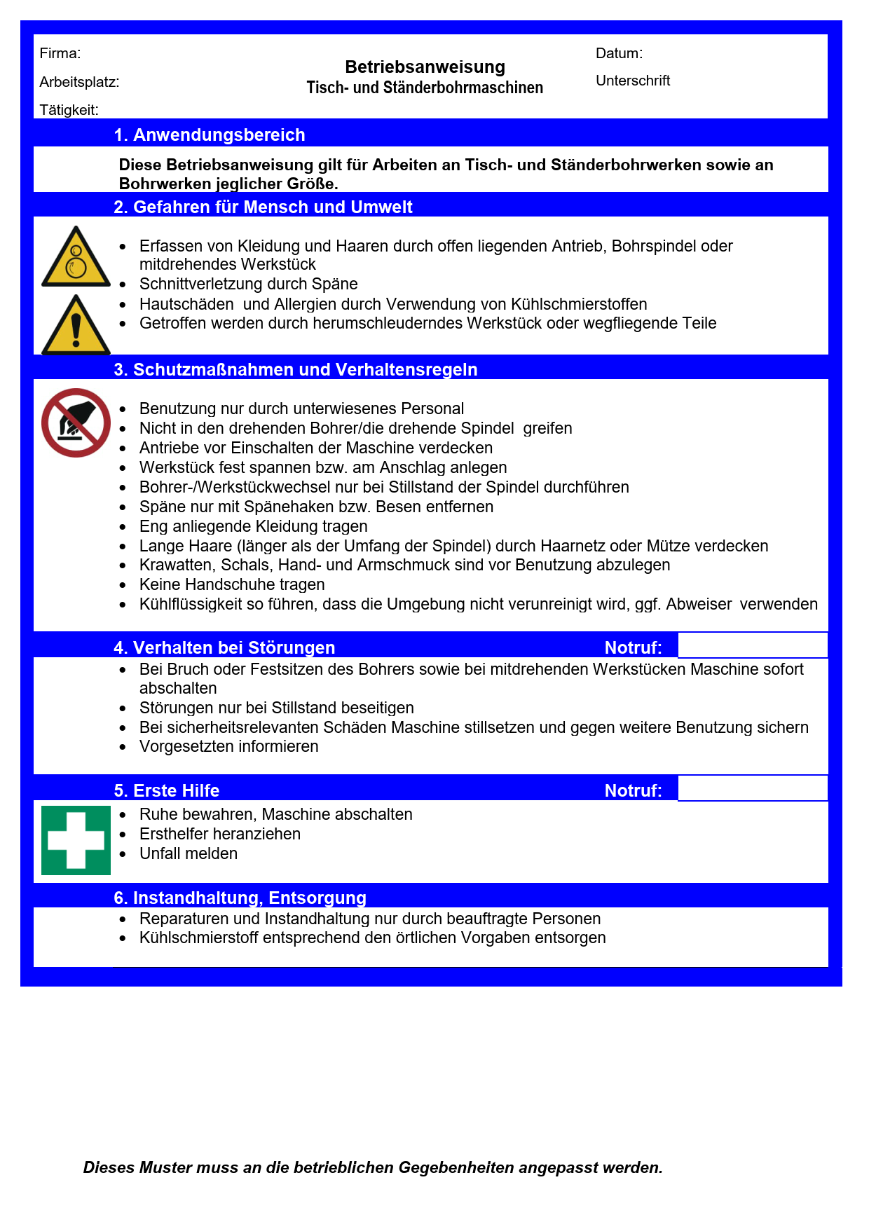 Diese Muster-Betriebsanweisung thematisiert Gefährdungen beim Umgang mit Tischbohrmaschinen sowie Ständerbohrmaschinen und enthält Informationen u. a. zu Schutzmaßnahmen und zum Verhalten im Gefahren- oder Störfall. Dieses Muster muss an die betrieblichen Gegebenheiten angepasst werden.