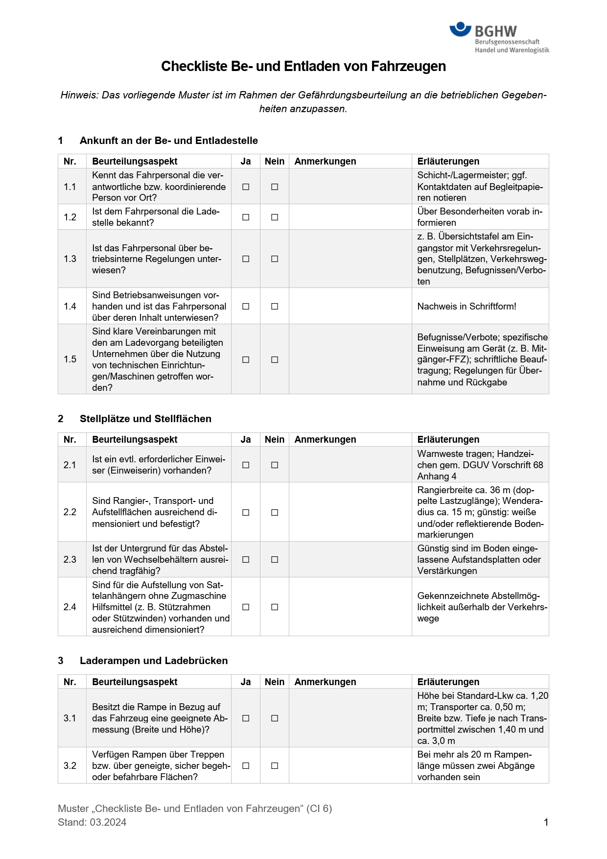 Diese Checkliste dient als Hilfestellung für die Gefährdungsbeurteilung. Sie enthält Fragen u. a. zu folgenden Themen: Ankunft an der Belade- und Entladestelle, Stellplätze und Stellflächen, Laderampen und Ladebrücken sowie Ladung und Verladeprozess.
