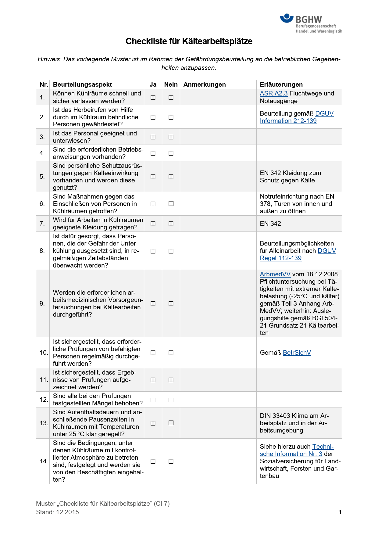 Diese Checkliste dient als Hilfestellung für die Gefährdungsbeurteilung. Sie enthält Fragen zu den Arbeitsbedingungen in Kühlräumen im eigenen Unternehmen/Lager.