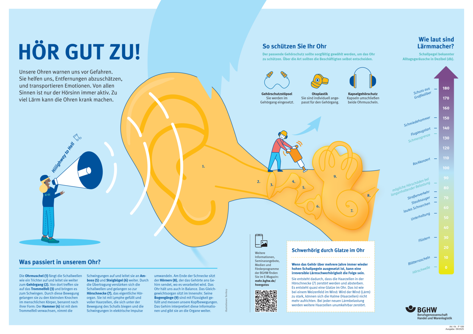 Dieses Plakat (Format: DIN A2) soll für die Gefahren unterschiedlicher Lärmquellen sensibilisieren und beschreibt zudem die Funktionsweise des menschlichen Gehörs sowie verschiedene Typen von Gehörschützern.