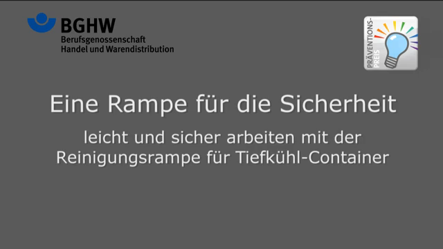 Dieses Video (Dauer: 03:24 Min.) stellt einen Gewinnerbeitrag des Präventionspreises „Die Goldene Hand“ aus dem Jahr 2013 vor. Vom Logistik- und Verwaltungsstandort der Rewe Group in Hungen aus werden über 400 Märkte im Umkreis mit Ware beliefert. Der Transport der Tiefkühlware erfolgt in speziellen Tiefkühl-Containern, deren Reinigung sich früher schwierig gestaltete. Beim Versuch, die Container zu kippen, um das Restwasser ablaufen zu lassen, konnten sich Beschäftigte verletzen. Mittlerweile ist die Verletzungsgefahr gebannt, denn Rewe benutzt nur noch eine selbstentwickelte Reinigungs-Rampe, in die die Container mit den Rädern quasi eingehängt werden. Sie können nicht mehr wegrollen oder umkippen. Die kostengünstige Vorrichtung erleichtert die Arbeit, die gleichzeitig schneller und sicherer erledigt werden kann.
