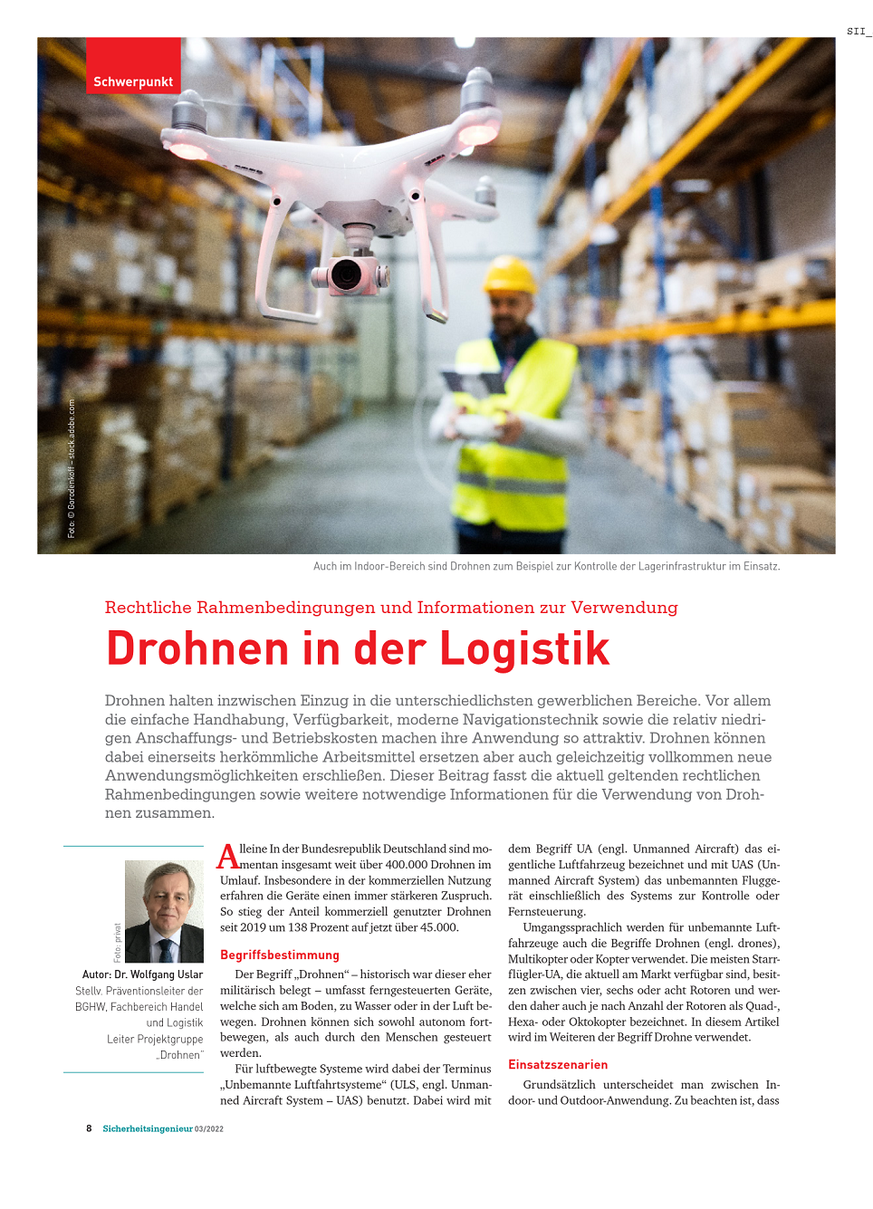 Dieser Fachartikel fasst die geltenden rechtlichen Rahmenbedingungen sowie weitere notwendige Informationen für die Verwendung von Drohnen zusammen und soll eine Hilfestellung für diejenigen sein, die den Einsatz von Drohnen in ihren betrieblichen Abläufen planen. Enthalten sind u. a. Informationen zu Einsatzmöglichkeiten im Indoor- sowie Outdoorbereich sowie Hinweise zur Gefährdungsbeurteilung.