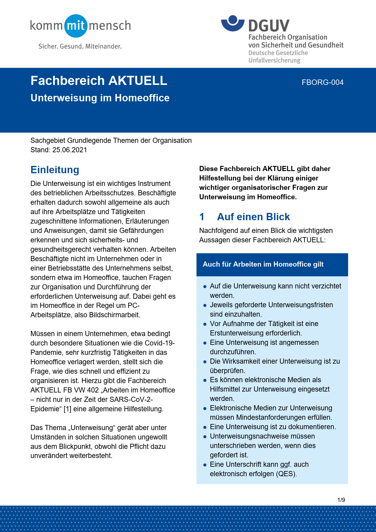 Diese Fachbereich AKTUELL gibt Hilfestellung bei der Klärung wichtiger organisatorischer Fragen zur Unterweisung im Homeoffice. Themen sind u. a.: Unterweisungspflicht, Abgrenzung zwischen Telearbeit, mobiler Arbeit und Homeoffice sowie häufige Fragestellungen zur Unterweisung im Homeoffice, z. B. zur Angemessenheit von Unterweisungen und Dokumentationsmöglichkeiten.
