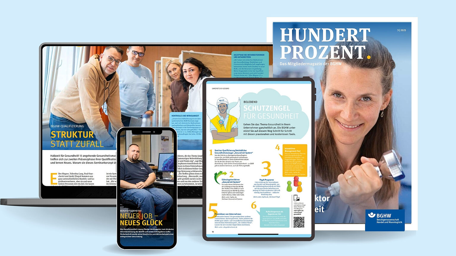 In dieser Rubrik finden Sie zukünftig Ausgaben des kostenlosen Printmagazins der BGHW z. B. mit Geschichten von Menschen aus dem Handel und der Warenlogistik, die stets im Einsatz für mehr Sicherheit und Gesundheit am Arbeitsplatz sind. Diese und viele weitere exklusive Inhalte bietet die HUNDERT PROZENT Printausgabe dreimal jährlich.