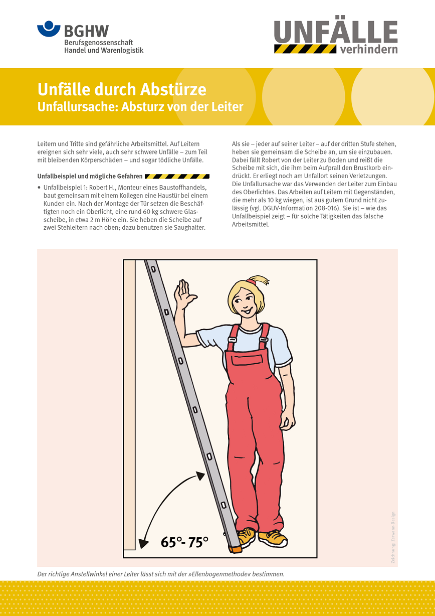 Diese Ausgabe der Reihe „Unfälle verhindern“ thematisiert Abstürze von Leitern. Neben zwei Unfallbeispielen sind Empfehlungen für technische, organisatorische und personenbezogene Maßnahmen zur Unfallvermeidung enthalten. Die zugehörige PowerPoint-Präsentation kann als Unterstützung für Unterweisungen genutzt werden.
