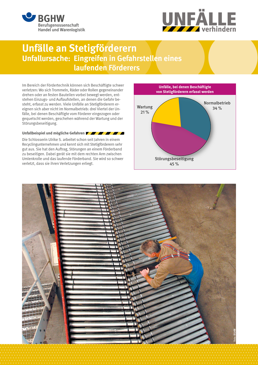 - Unfälle an Stetigförderern - Unfallursache: Eingreifen in Gefahrstellen eines laufenden Förderers (PDF, 5,20 MB)