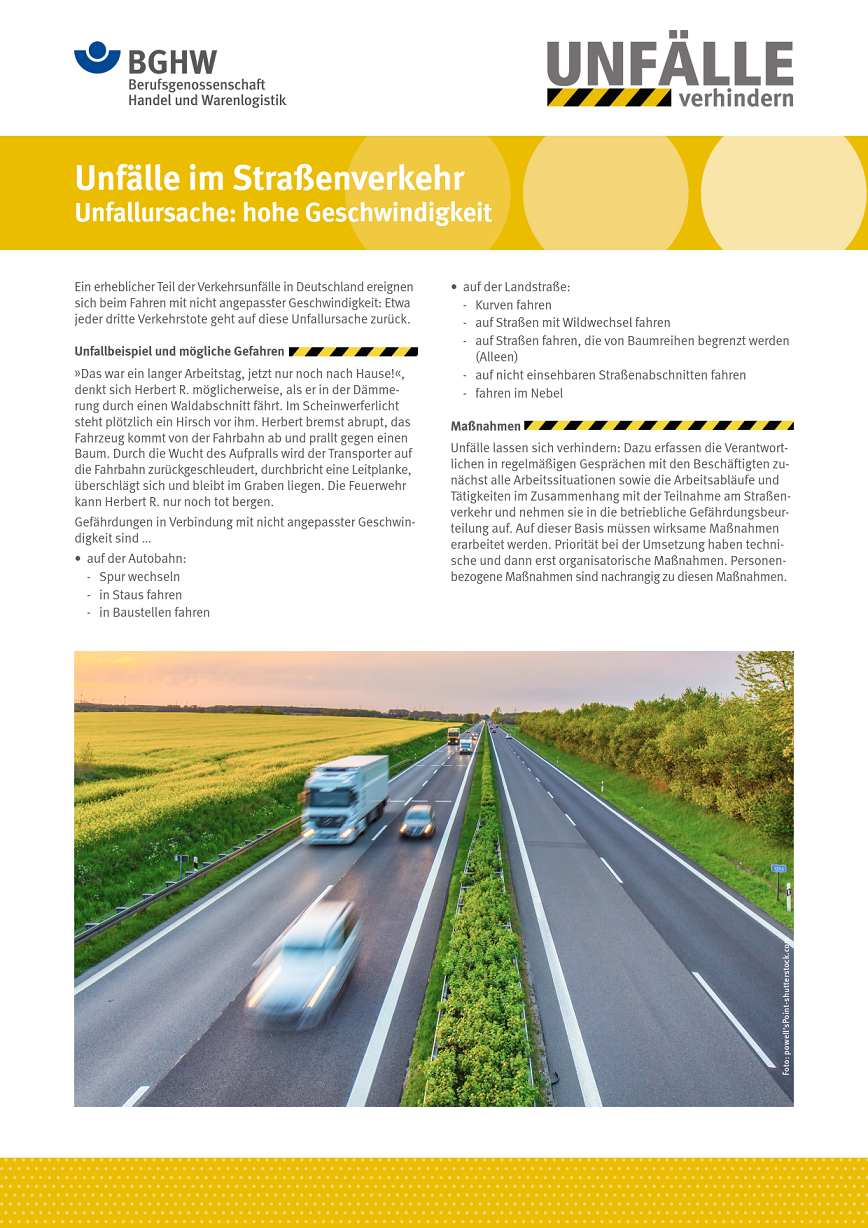 Diese Ausgabe der Reihe „Unfälle verhindern“ thematisiert Straßenverkehrsunfälle, die häufig durch überhöhte Geschwindigkeit verursacht werden. Neben einem Unfallbeispiel sind Empfehlungen für technische, organisatorische und personenbezogene Maßnahmen zur Unfallvermeidung enthalten. Die zugehörige PowerPoint-Präsentation kann als Unterstützung für Unterweisungen genutzt werden.