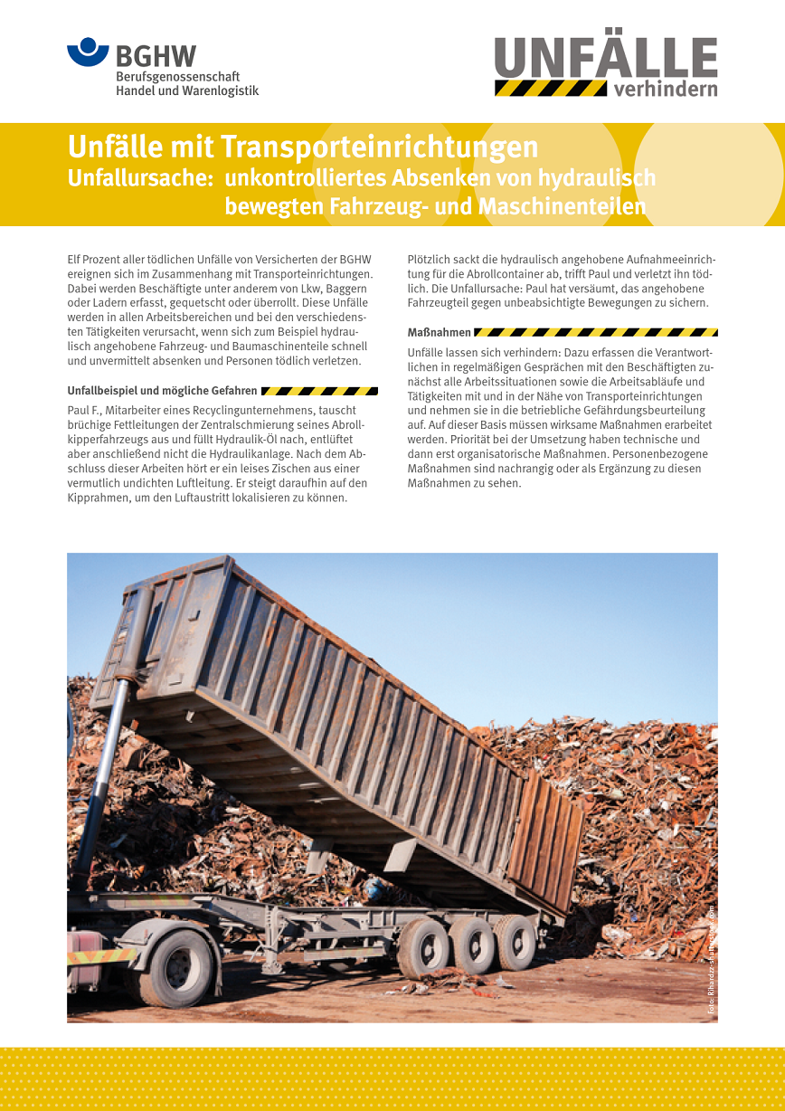- Unfälle mit Transporteinrichtungen - Unfallursache: unkontrolliertes Absenken von hydraulisch bewegten Fahrzeug- und Maschinenteilen (PDF, 1,09 MB)