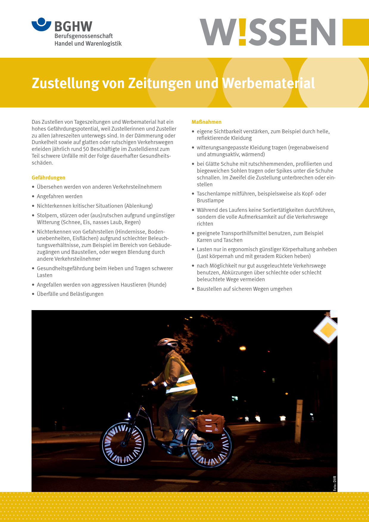 Dieses BGHW-Wissen informiert über die Gefährdungen, denen Zeitungszustellerinnen und Zeitungszusteller bei ihrer Arbeit ausgesetzt sind, sowie mögliche Schutzmaßnahmen. Es enthält zudem Hinweise auf weiterführende Informationen.