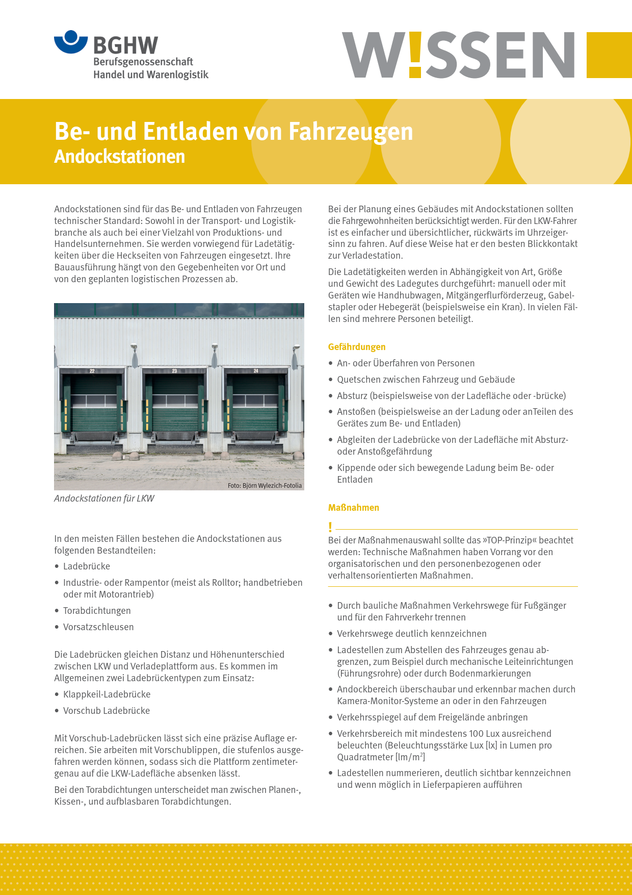 Dieses BGHW-Wissen informiert über Gefährdungen und Schutzmaßnahmen bei Arbeiten an Ladestellen mit Andockstationen. Es enthält zudem Hinweise auf weiterführende Informationen.