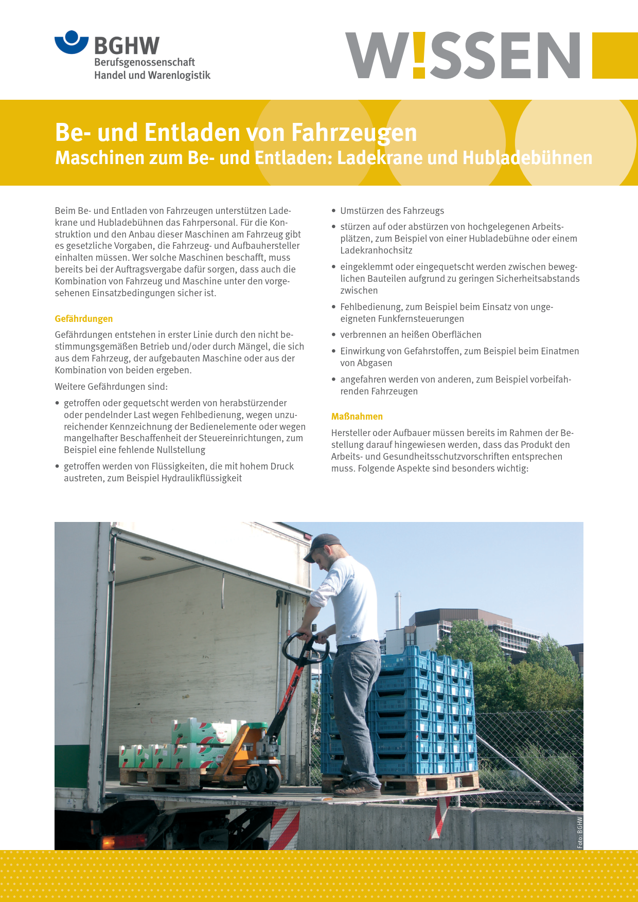 Dieses BGHW-Wissen informiert über Gefährdungen und Schutzmaßnahmen bei der Verwendung von fahrzeuggebundenen Ladekränen und Hubladebühnen. Es enthält zudem Hinweise auf weiterführende Informationen.