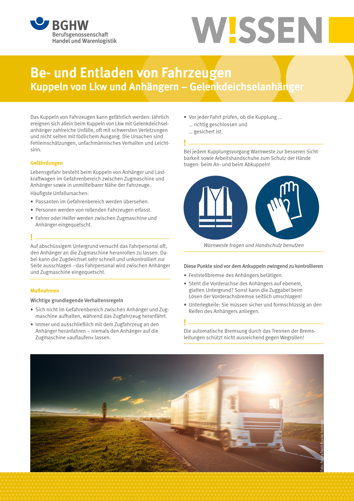 Dieses BGHW-Wissen informiert über Gefährdungen und Schutzmaßnahmen beim Kuppeln von Deichselanhängern an Lastkraftwagen. Es enthält zudem Hinweise auf weiterführende Informationen.