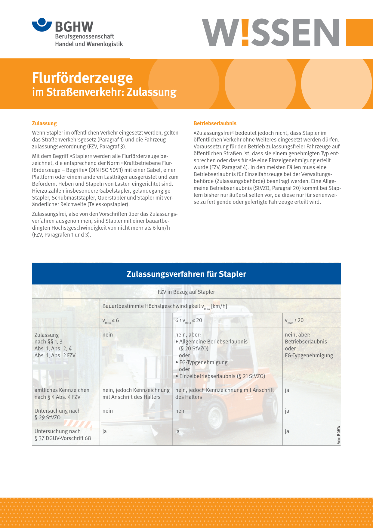 Dieses BGHW-Wissen informiert über besondere Vorschriften für die Zulassung von Flurförderzeugen im öffentlichen Straßenverkehr. Es beschreibt die verschiedenen Zulassungsarten und die hierfür erforderliche technische Ausstattung. Es enthält zudem Hinweise auf weiterführende Informationen.