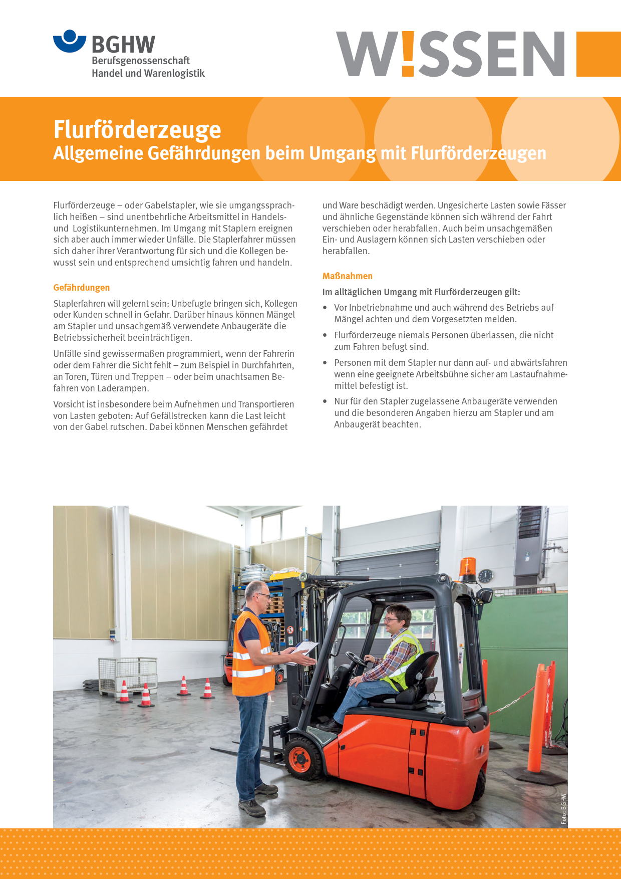 Dieses BGHW-Wissen informiert über die grundsätzlichen Gefährdungen und Schutzmaßnahmen beim Umgang mit Flurförderzeugen. Es enthält zudem Hinweise auf weiterführende Informationen.