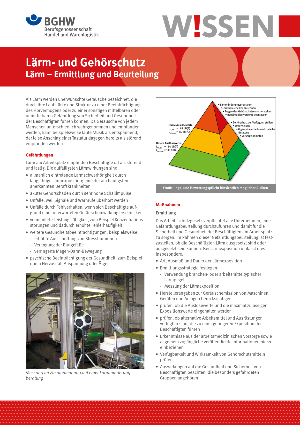 Dieses BGHW-Wissen informiert über Gefährdungen durch Lärm am Arbeitsplatz, die Ermittlung und Beurteilung der Lärmexposition sowie erforderliche Schutzmaßnahmen. Enthalten sind darüber hinaus Hinweise auf weiterführende Informationen.