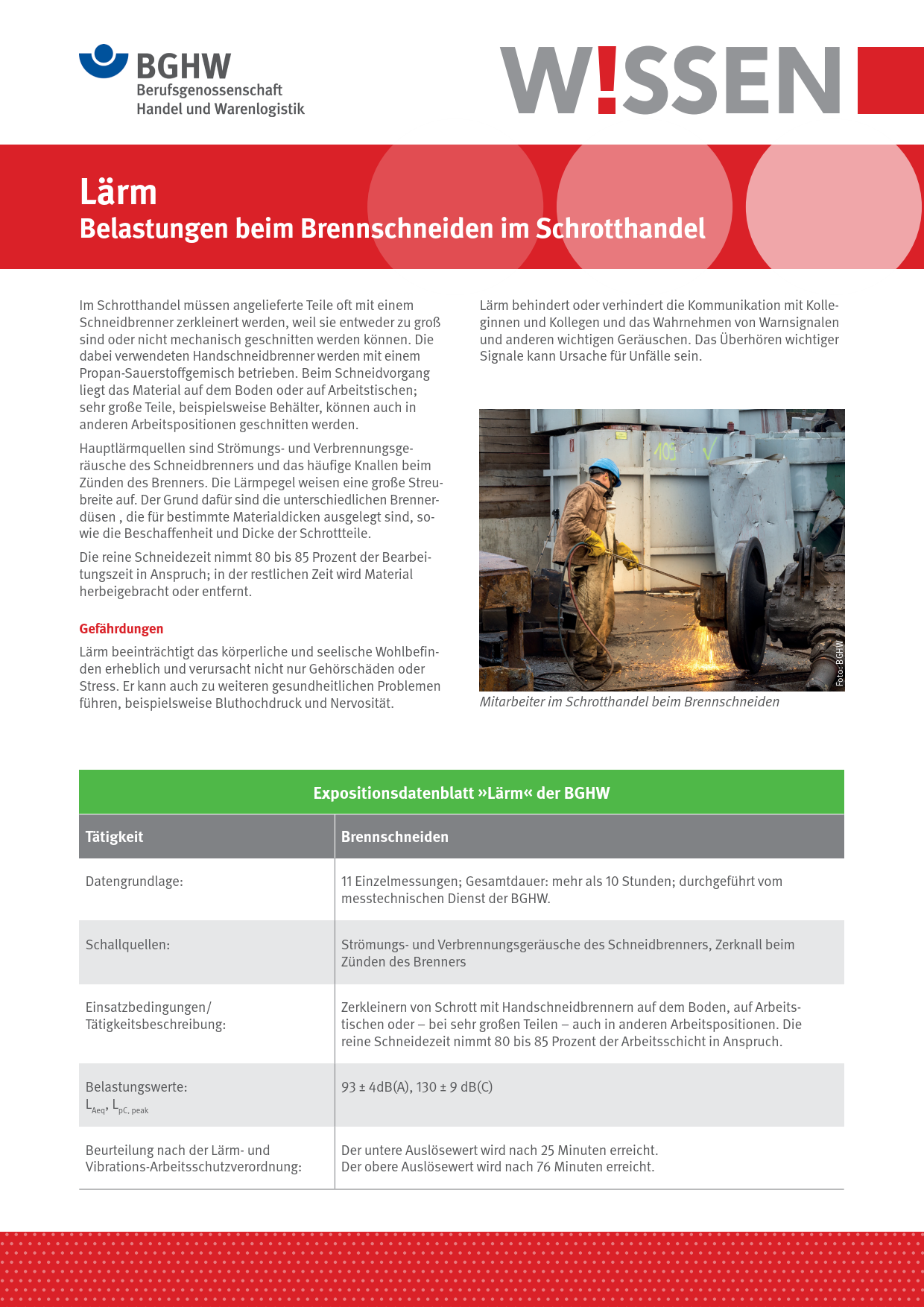 Dieses BGHW-Wissen befasst sich mit der Lärmbelastung beim Zerkleinern von Schrott mit Handschneidbrennern. Als Unterstützung für die Gefährdungsbeurteilung enthält es ein Expositionsdatenblatt inkl. Beurteilung der Gefährdungssituation, das auf zahlreichen Messungen der BGHW beruht. Hinweise auf sinnvolle Schutzmaßnahmen sowie zu weiterführenden Informationen sind ebenfalls enthalten.