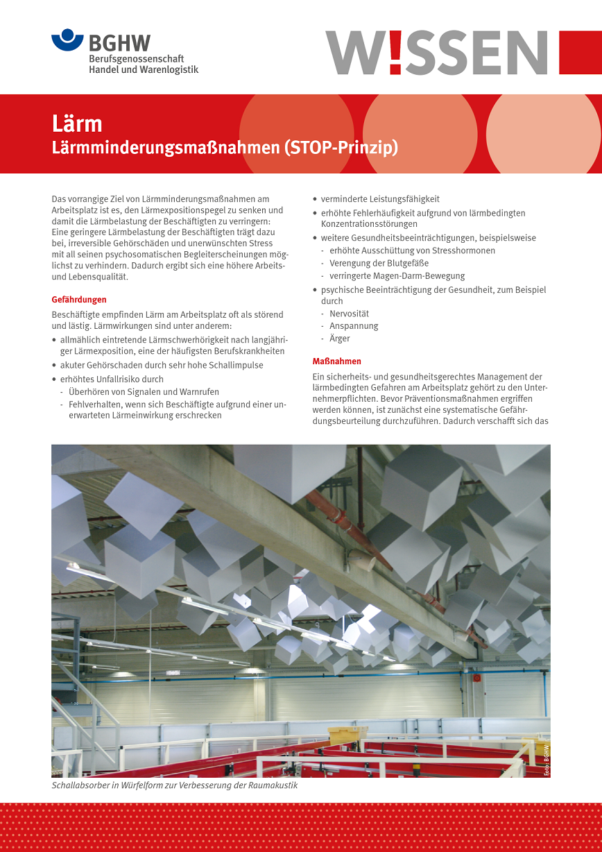 Dieses BGHW-Wissen beschreibt die grundsätzliche Vorgehensweise und Rangfolge von Maßnahmen zur Vermeidung von gesundheitsschädlichen Lärm. Die Rangfolge der zu treffenden Maßnahmen folgt dem im Arbeitsschutz üblichen STOP-Prinzip: Substitution (S), technische (T), organisatorische (O) und persönliche (P) Maßnahmen und erläutert diese anhand von Beispielen. Weiterführende Informationen sind ebenfalls enthalten.