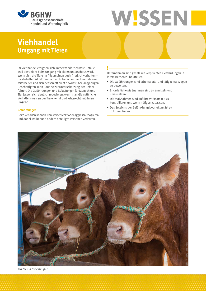 Dieses BGHW-Wissen erläutert Gefährdungen, die sich im Umgang mit Tieren, insbesondere beim Treiben und Führen oder unter Stress ergeben können. Es zeigt geeignete Schutzmaßnahmen und enthält zudem Hinweise auf weiterführende Informationen.