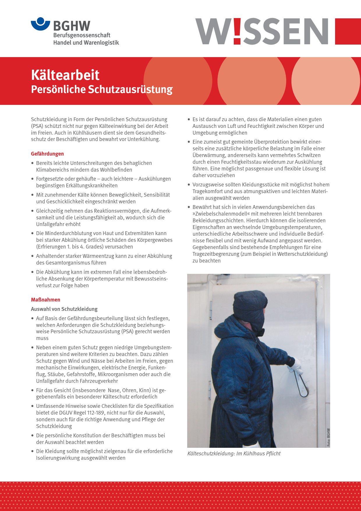 Dieses BGHW-Wissen informiert über die Gefährdungen durch Arbeiten bei Kälte und geht auf geeignete Schutzkleidung sowie weitere Persönliche Schutzausrüstung ein. Enthalten sind zudem Hinweise auf weiterführende Informationen.