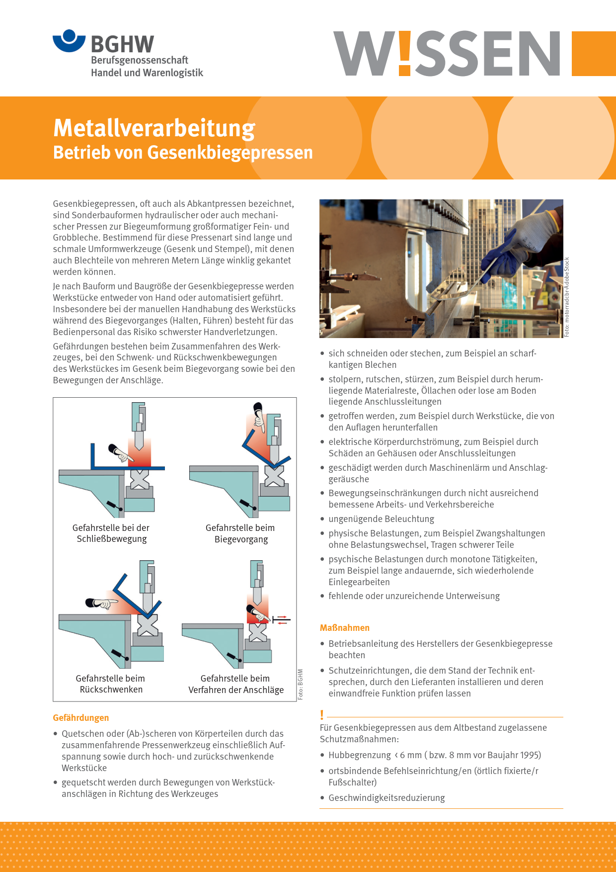 Dieses BGHW-Wissen befasst sich mit Gefährdungen und Schutzmaßnahmen beim Arbeiten an Gesenkbiegepressen, die Sonderbauformen hydraulischer oder mechanischer Pressen zur Biegeumformung großformatiger Fein- und Grobbleche darstellen. Enthalten sind zudem Hinweise auf weiterführende Informationen.