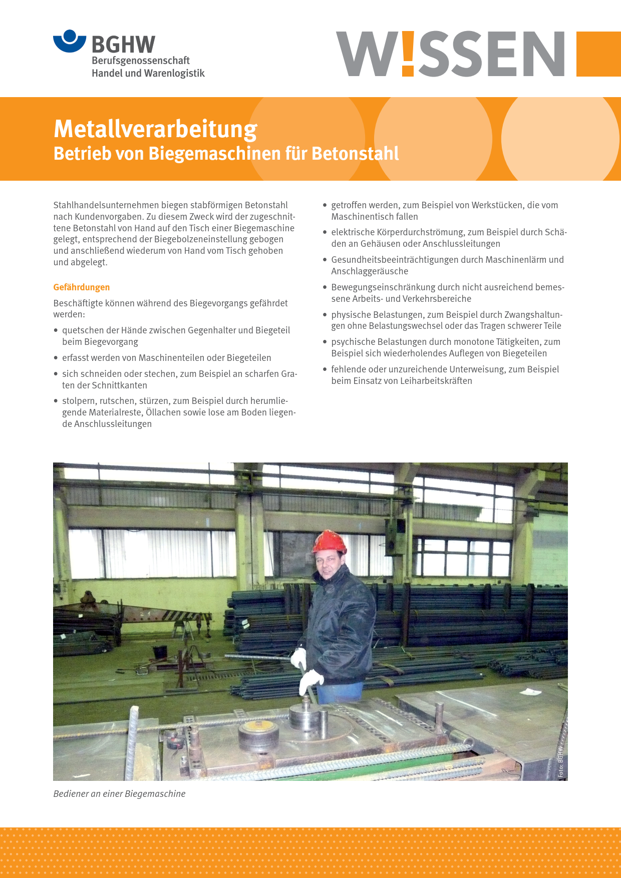 Dieses BGHW-Wissen befasst sich mit Gefährdungen und Schutzmaßnahmen beim Arbeiten an Biegemaschinen für Betonstahl. Enthalten sind zudem Hinweise auf weiterführende Informationen.