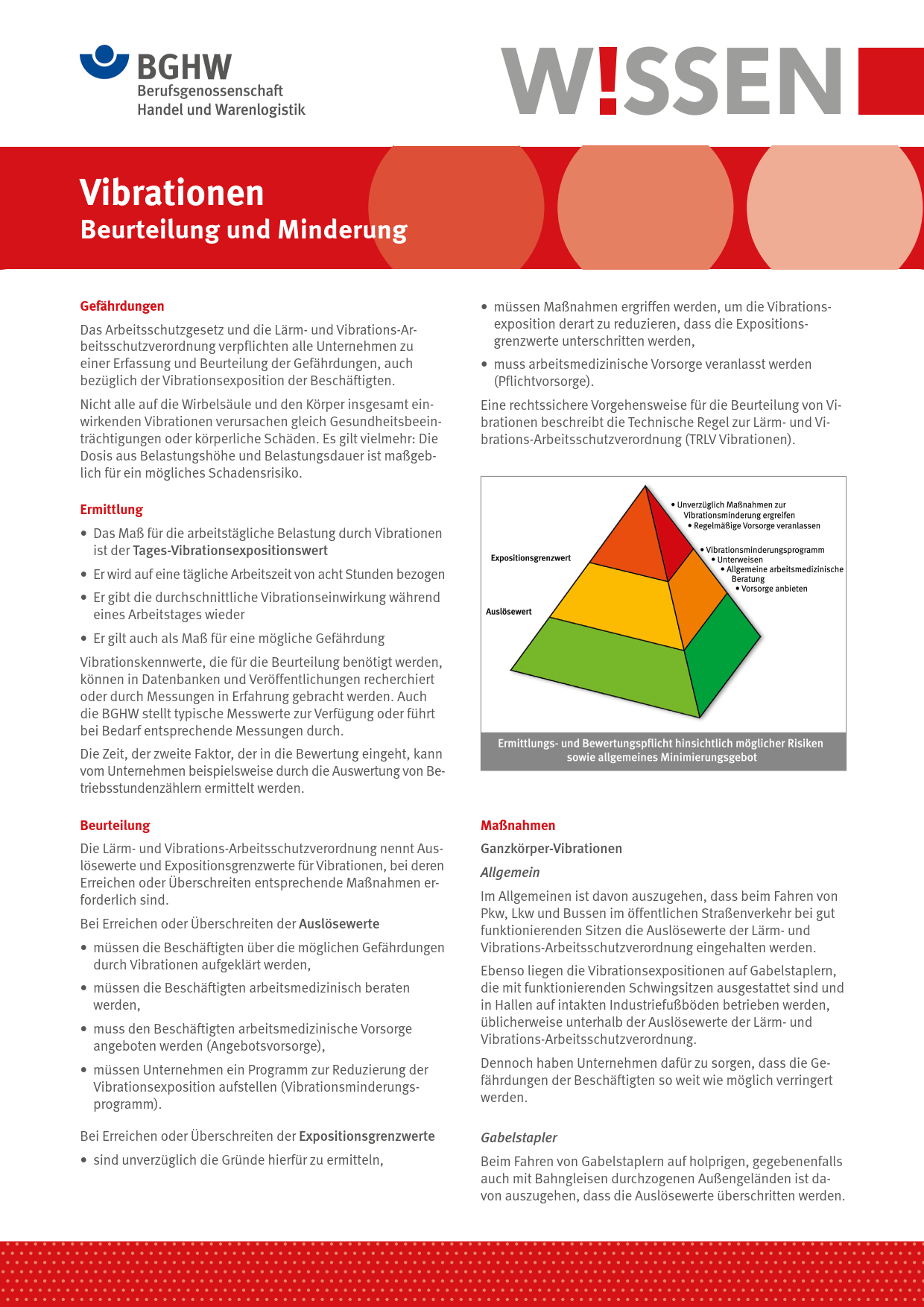 Dieses BGHW-Wissen bietet eine grundlegende Übersicht über gesundheitliche Auswirkungen von Vibrationsbelastungen, deren Ermittlung und Beurteilung sowie über Maßnahmen bei Ganzkörper-Vibrationen und Hand-Arm-Vibrationen. Es enthält Hinweise auf mögliche Schutzmaßnahmen und weiterführende Informationen.