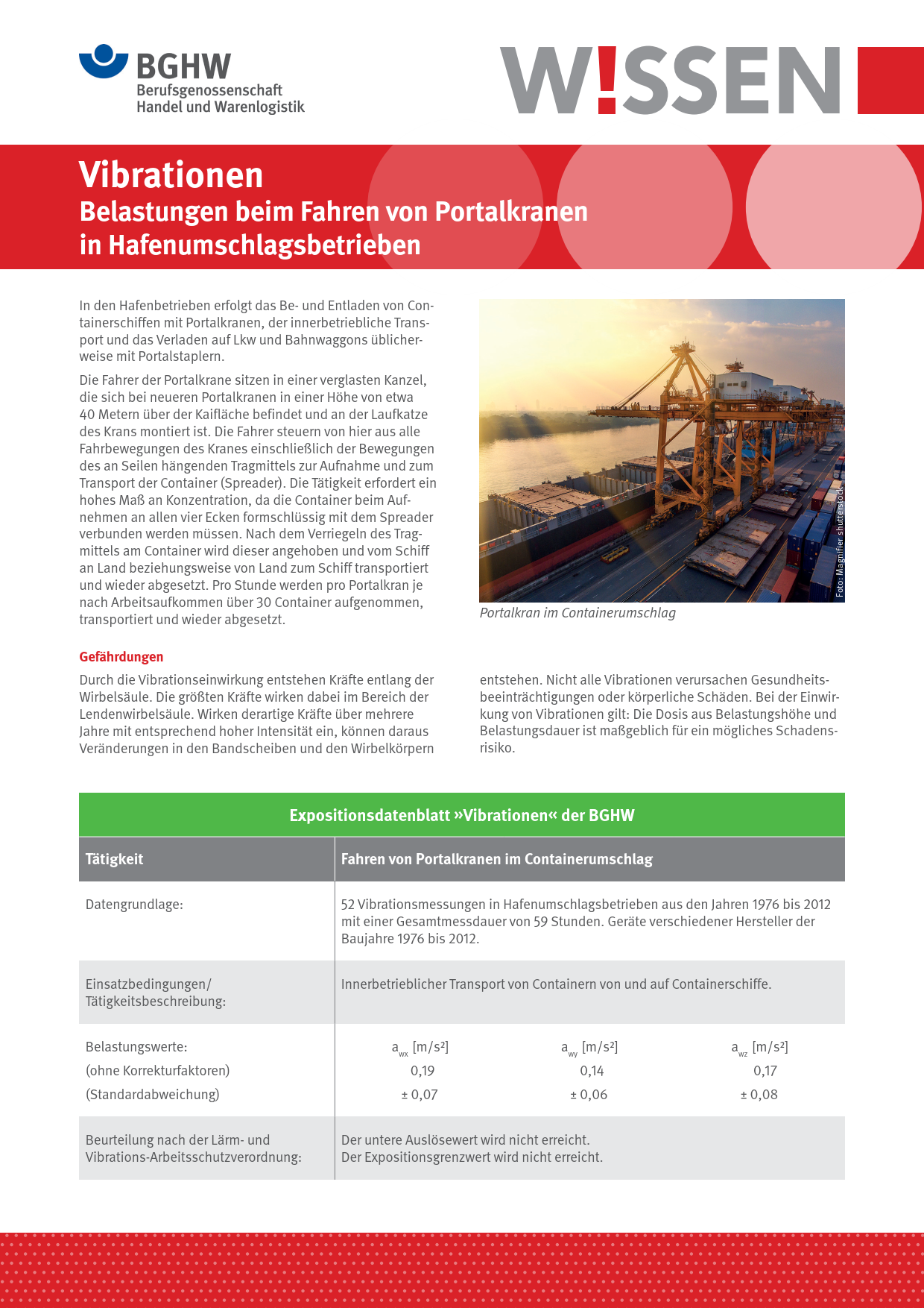 Dieses BGHW-Wissen befasst sich mit der Belastung durch Vibrationen beim Fahren mit Portalkranen im Containerumschlag. Als Unterstützung für die Gefährdungsbeurteilung enthält es ein Expositionsdatenblatt inkl. Beurteilung der Gefährdungssituation, das auf zahlreichen Messungen der BGHW beruht. Hinweise auf sinnvolle Schutzmaßnahmen sowie zu weiterführenden Informationen sind ebenfalls enthalten.