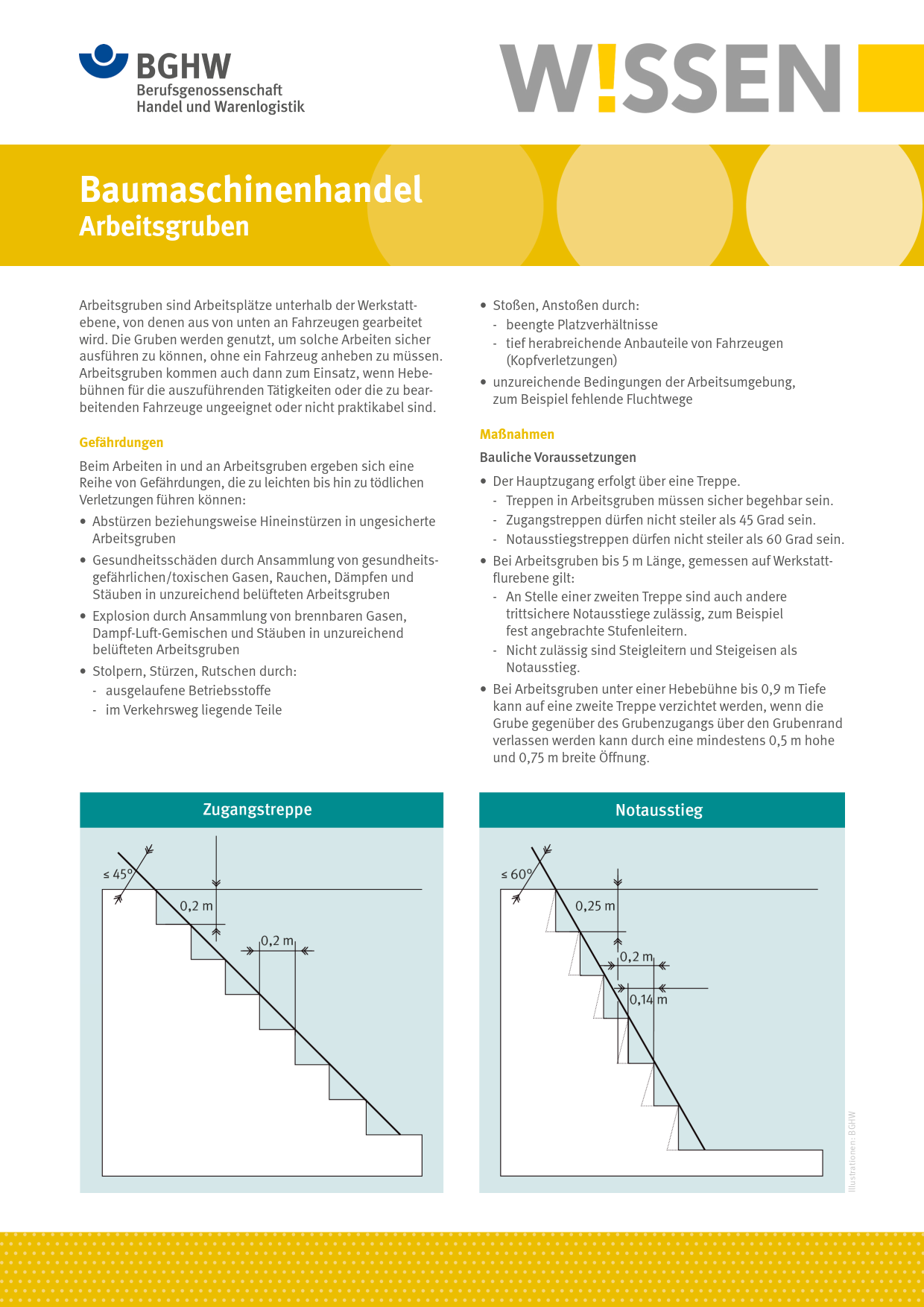 Dieses BGHW-Wissen informiert über die Gefährdungen beim Arbeiten in und an Arbeitsgruben. Es benennt die baulichen, technischen und verhaltensbasierten Schutzmaßnahmen und enthält Hinweise auf weiterführende Informationen.