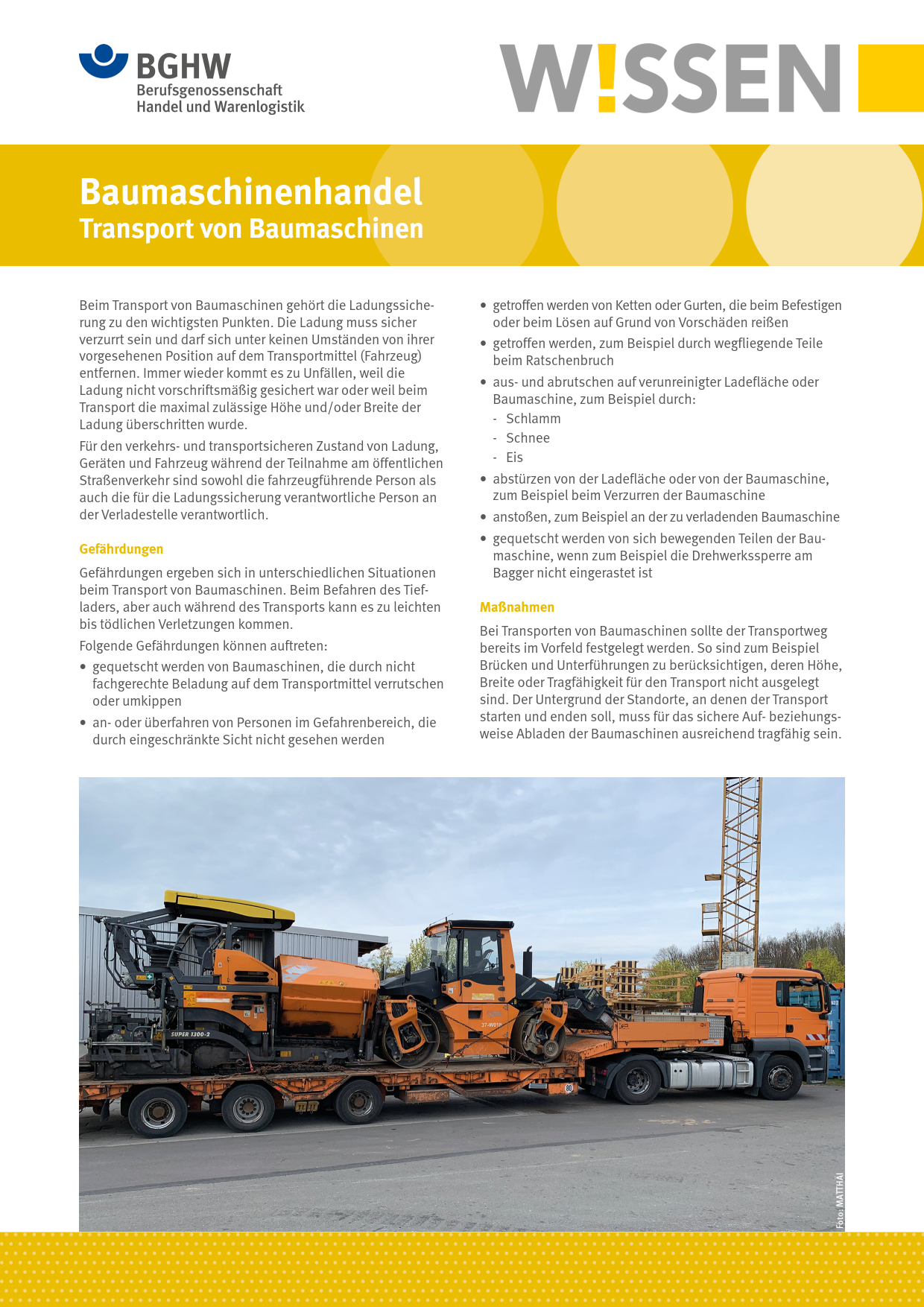 Dieses BGHW-Wissen informiert über die besonderen Gefährdungen beim Aufladen, Abladen und Transport von Baumaschinen. Es benennt die Schutzmaßnahmen, insbesondere die Ladungssicherung, und enthält Hinweise auf weiterführende Informationen.